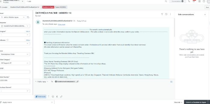 A Zendesk ticket titled [Rakuten Marketplace] Order Details Confirmation (automatic email) will be received. Click the Purchase History link in the ticket.